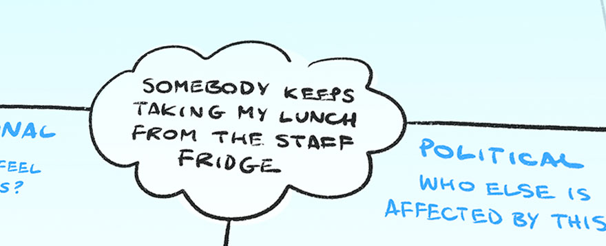 Depending on the problem, your page should start revealing some insights to you. Maybe you don’t have much in the ‘rational’ space, but a lot in the ‘political’ space? Or maybe there’s SO MUCH on the page, that you need to scope the problem down a little bit?
