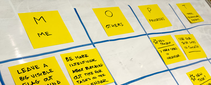 Note how a couple of cells in my example above just didn’t apply, and that’s fine. Mixing written notes and pictures is also fine. What this does is it arranges our thinking spatially, rather than just as a list… or with no form at all. Once you fill your MOPT table, you can go back over it and pick out the ideas that are most resonant and relevant.