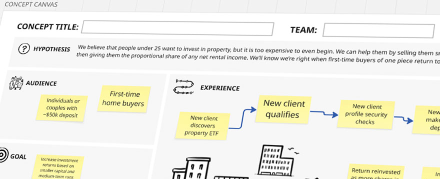 Ask everyone to refine and combine all those ‘small’ ideas into their strongest three ideas, and fill in a Concept Canvas (above) to flesh out each of those ideas into a more realised concept.