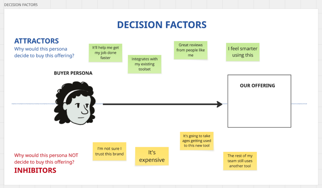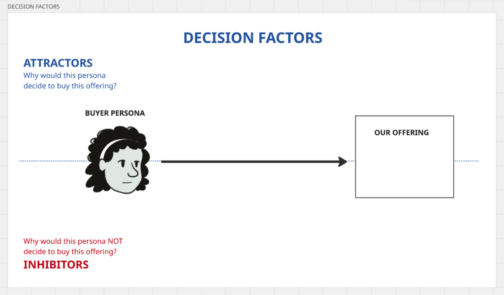 Start by drawing the basic framework of the Decision Factors sketch on a whiteboard, flipchart, or even just a piece of office paper. You can even put these elements together in an online collaboration space like Miro or Mural. The example images below all come from Miro (and uses a head drawing for the buyer persona from my Storyboarding Toolkit).