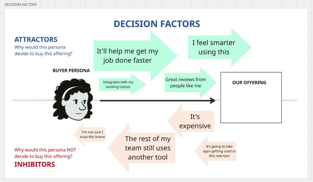 By mapping out the factors in this way, you can really put yourself into the mind and shoes of that person, spot gaps in your understanding, and enrich your own thinking about the relationship between your offering and your customers/stakeholders. Let’s take a closer look…