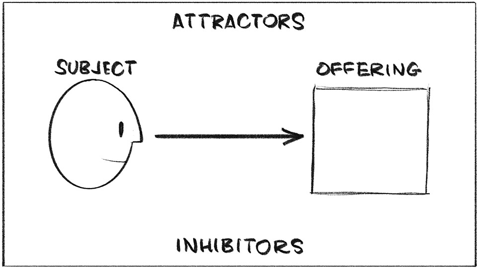 Capture what you’re thinking, or what others are saying, on the sketch as you go, and draw an arrow going forward or backward, to signify the attractors and inhibitors. Messy is totally OK; this is definitely a case where the process of using this sketch is often better than the final product.