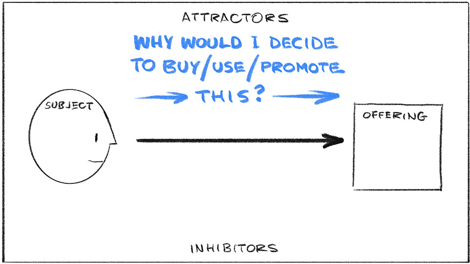By using this sketch to list out the factors that encourage someone to make a decision in favour of your offering, you pull the focus of the offering from its features (usually what we think about the most) to what those features are for.