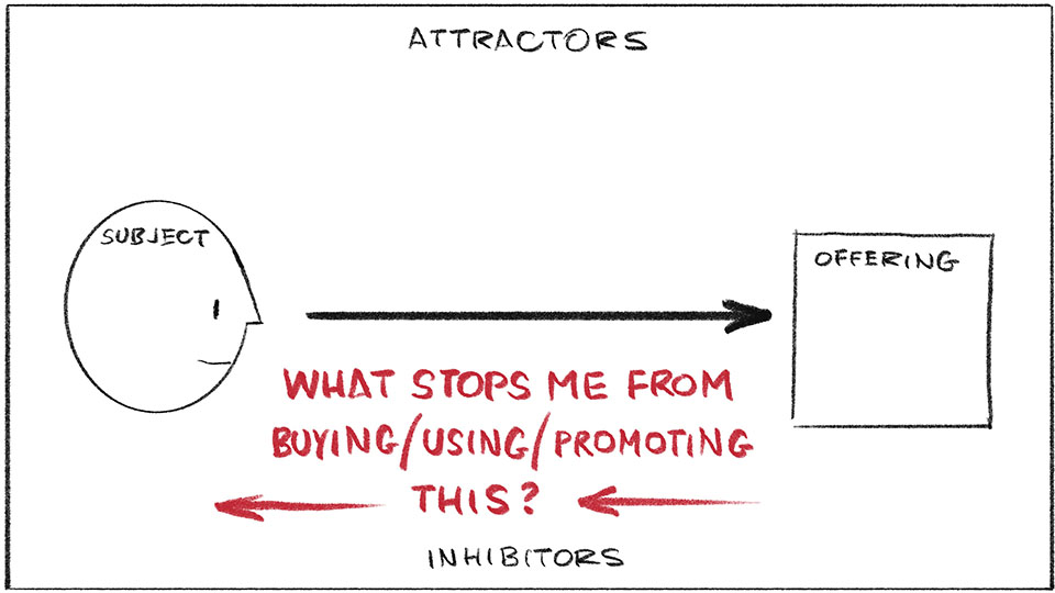 Inhibitors are the forces that turn us off, hold us back, or get in the way of deciding to buy or change. Often I find that teams ignore these, but defining them and mapping them can be super insightful.