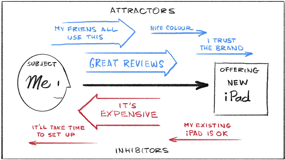 I want to show you a simple framework that has helped me apply the essence of this research: the Decision Factors sketch. It helps you visualise the various factors going on as we make decisions for behaviour change, whether that change is to make a purchase, to join a meeting, to approve a design… anything at all.