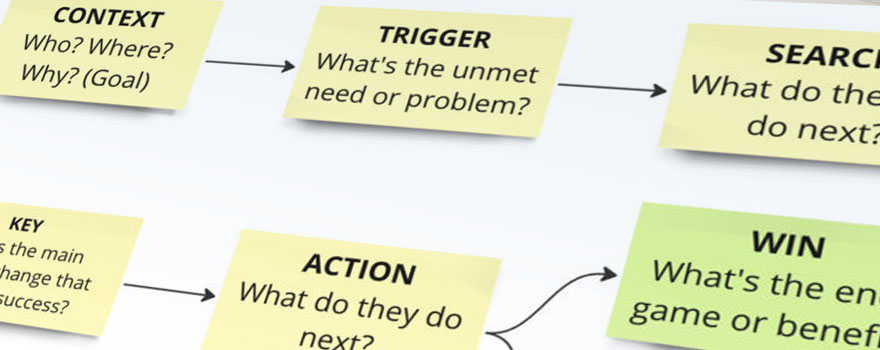 You can use this structure as a way to synthesise and translate the various elements you have into a visual story that your audience can read and act on, based on the 6 ‘stages’ listed above.